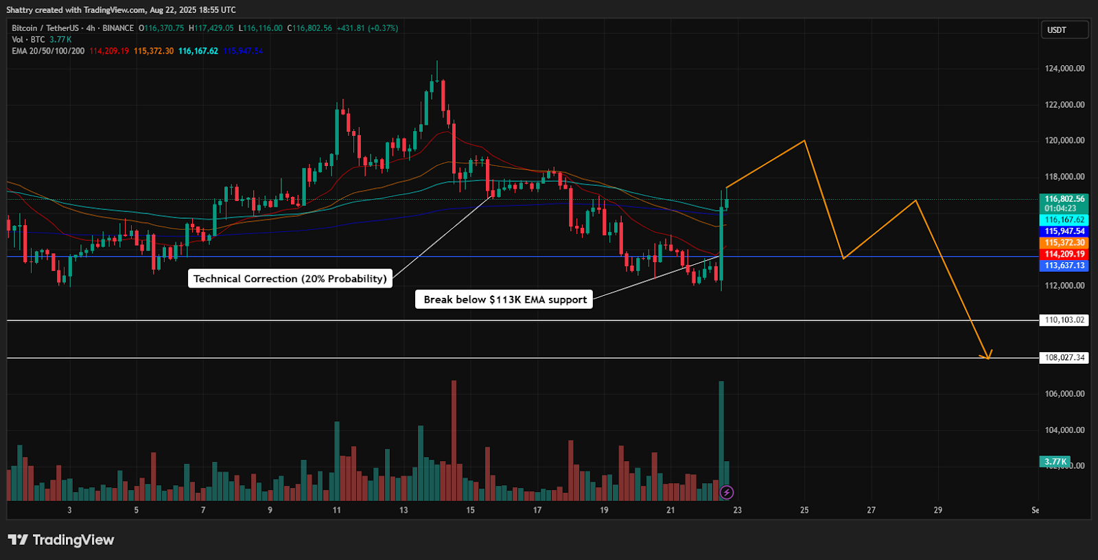 A break below $113K EMA support could trigger selling toward $108K–$110K levels, representing 7–10% downside.