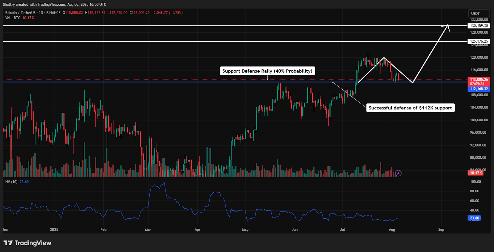 Successful defense of $112K support combined with regulatory progress could drive recovery toward $125K-$130K, representing 10-15% upside from current levels.