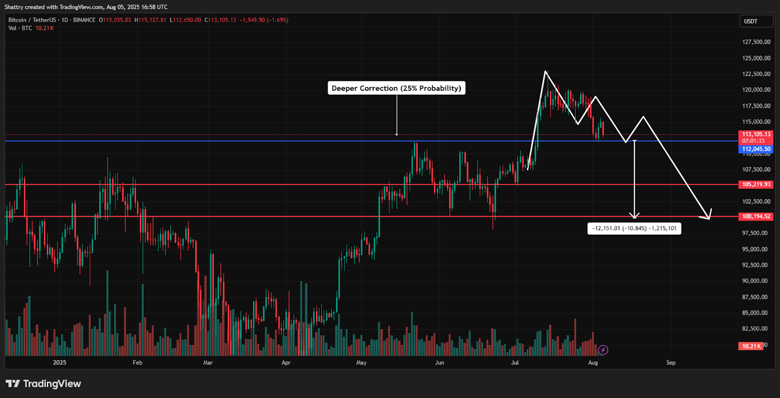 Breaking below $112K support could trigger selling toward $100K-$105K major support zone, representing 10-15% downside.