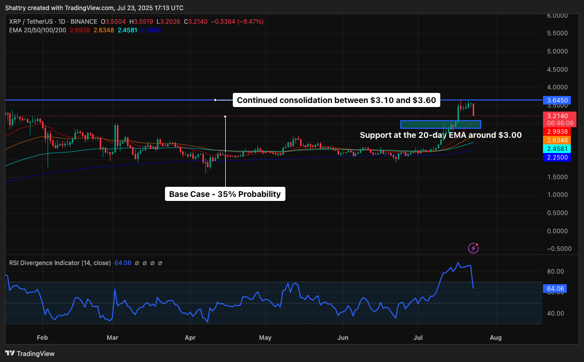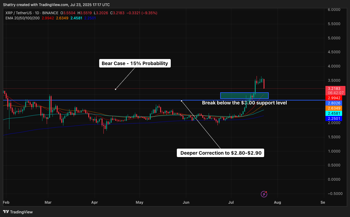 XRP’s pullback from $3.55 toward $3.30 support represents a healthy 7% correction within the context of an extraordinary year-to-date performance.