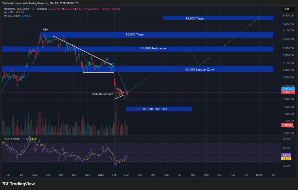 ETH currently trades under $2,000, with major resistance expected around $5,000 as seen by last August’s ATH of $4,946.05.
