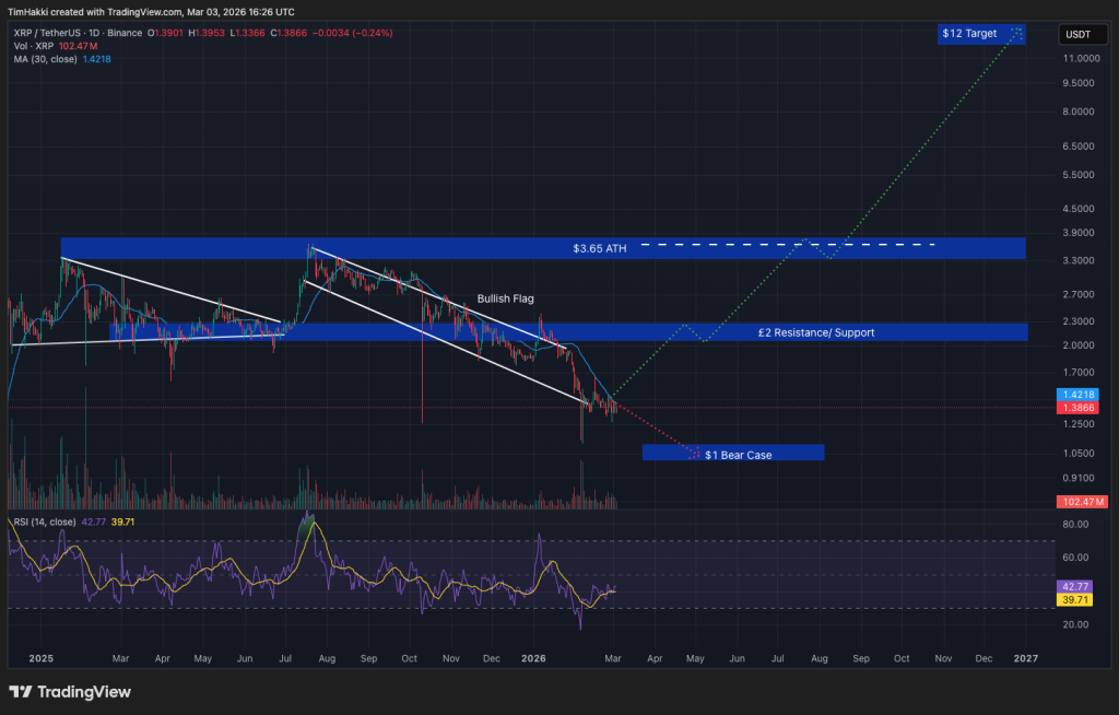 XRP is currently trading near $1.38, and Alibaba AI predicts a potential climb toward $12 this year, a ninefold return for current holders.