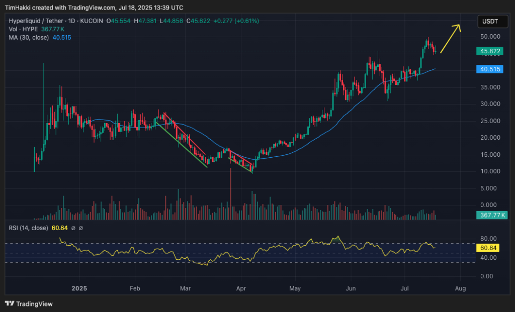 Indeed, between early April and May 26, $HYPE quadrupled in value, jumping from around $10 to $40. This rally was reinforced by multiple cup and handle formations, suggesting sustained interest from institutional-sized traders.
