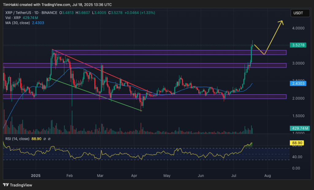 These large-scale purchases have pushed its relative strength index (RSI) to a heated 89, suggesting potential profit-taking ahead that will depreciate its price. However, the previous $3 resistance level is likely to switch to a strong psychological support level, priming XRP to run up to $5 by mid-fall and possibly even $20 by year end. .