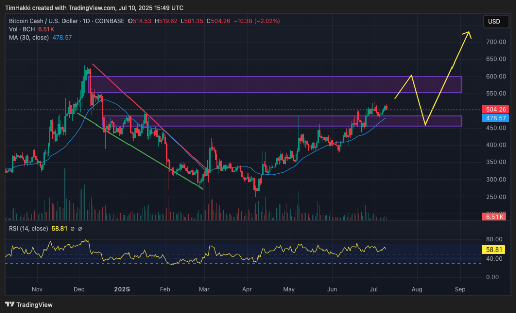 If positive market sentiment continues, BCH is expected to test resistance at $600 soon, with $700 remaining within reach by autumn.