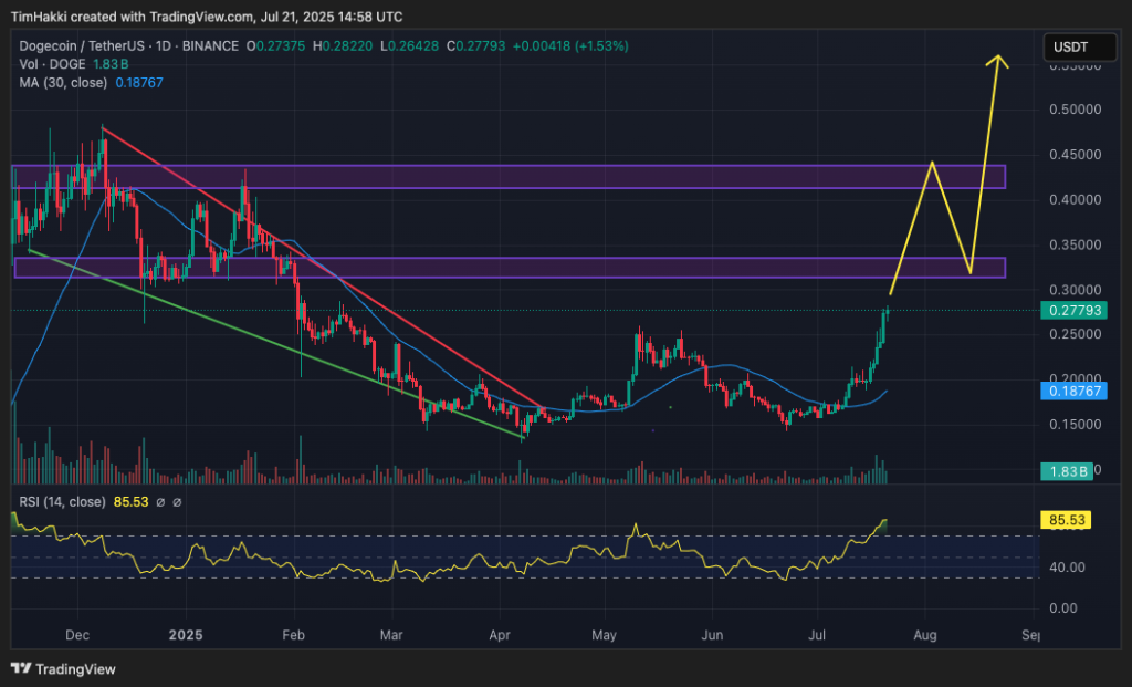 Technical analysis indicates the uptrend may continue, with DOGE’s RSI rising to 85, which means the token is overbought and may dip slightly in the short term as traders cash in on recent gains. But if it can rally slightly further up to $0.3, it will have found a firm footing on a strong support level, so a run up to $0.50 by late summer is conceivable.