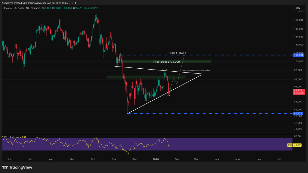 BTC is starting to tighten up inside a squeezing structure, with rising support pushing price into a descending resistance line. It is basically a classic compression setup.