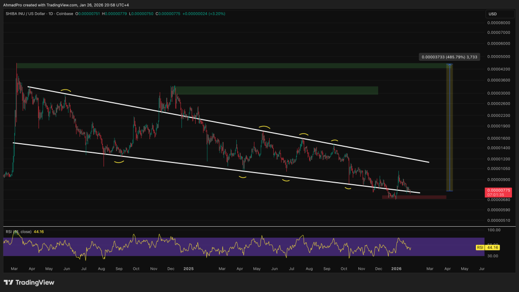 The Shiba Inu chart is basically a clean descending channel that has been respected for a long time, with lower highs and lower lows grinding price down in a very orderly way.