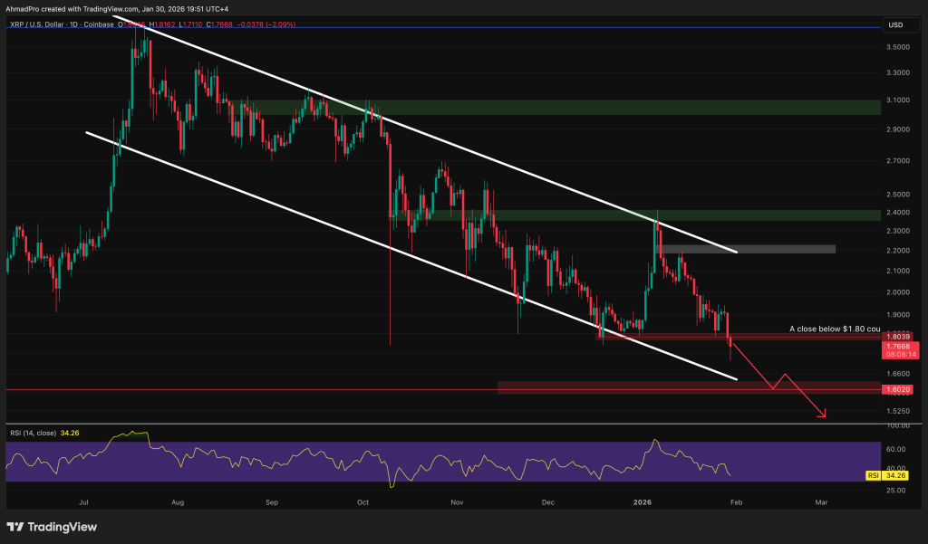 If XRP cannot quickly reclaim and hold above $1.80 on a daily close, the next logical level to watch is around $1.60, where prior demand and liquidity sit. Until that happens, any upside move is likely just corrective rather than the start of a real trend reversal, especially with the broader market still firmly risk off.
