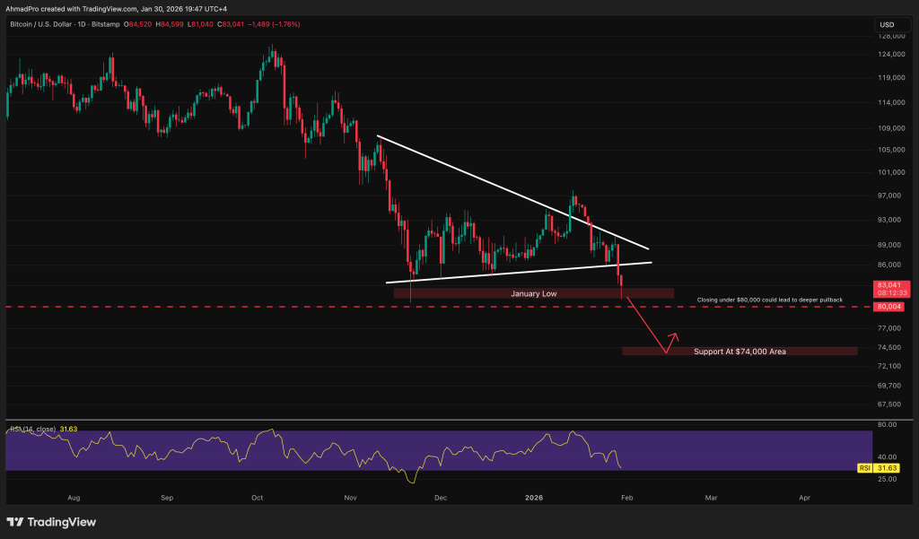 RSI is sitting around 31, so conditions are getting oversold. That tells us selling pressure is stretched, but it does not mean a bounce is guaranteed yet. Structurally, the focus shifts lower from here, with the $80,000 psychological level now under threat and the $74,000 support zone coming into view if momentum continues.