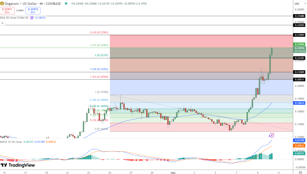 This formation often marks the start of a strong uptrend, indicating sustained buying interest. The breakout above the 1.618 Fibonacci extension at $0.2109 has further reinforced this positive sentiment, with DOGE now testing the 2.272 extension at $0.2298.