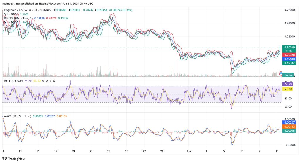 Dogecoin is trading at $0.2036 with modest intraday gains, supported by increasing volume and technical indicators pointing to bullish momentum.
