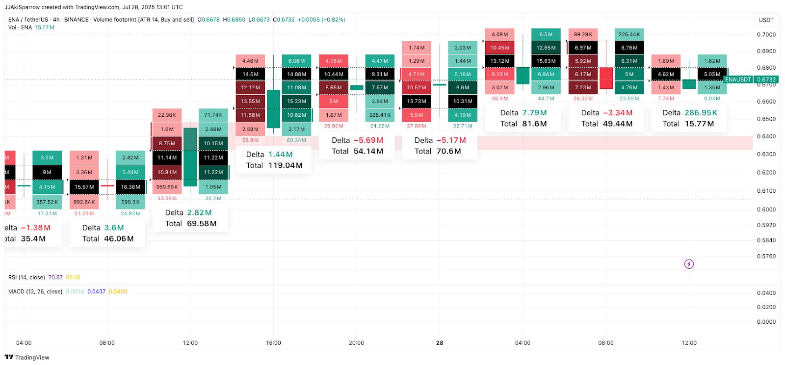 At first, buyers were in control. Order flow showed strong demand, with cumulative volume hitting 119M and positive deltas. But things changed near $0.67–$0.69.