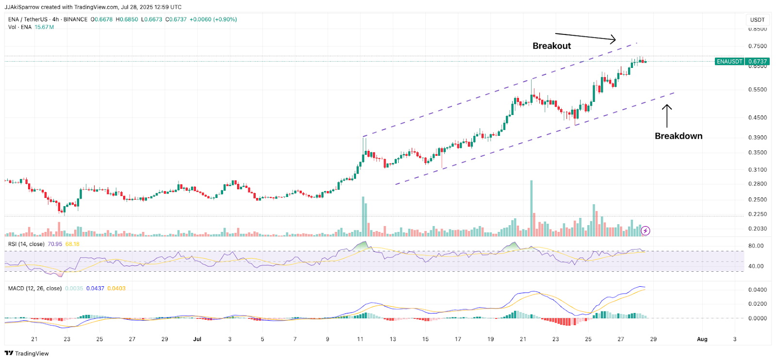 After weeks of methodical ascent within a rising parallel channel, $ENA/USDT has managed to punch through the upper boundary. But the breakout isn’t unfolding with the force it initially promised.