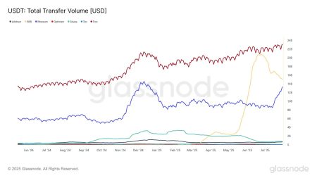 Glassnode reports that the 30-day moving average transfer volume of USDT has risen to $52.9 billion, recovering from 2022’s market downturn. But Ethereum’s share of USDT transaction volume has decreased.