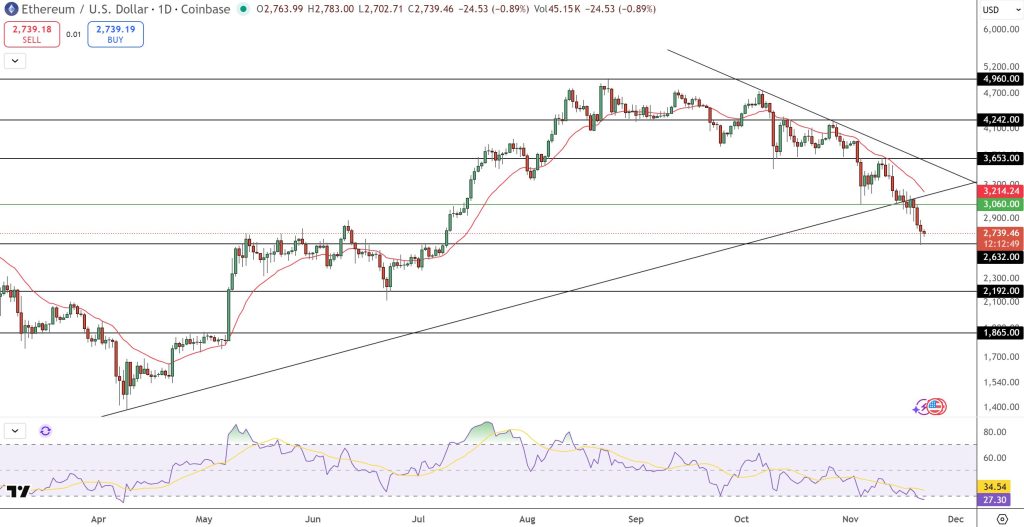 Ethereum price prediction has broken below its long-held trendline from March and is now trading inside a broad descending wedge, a structure that often forms during late-stage selloffs. Candles are printing long lower wicks, showing sellers failing to push price cleanly below the $2,630 support area.