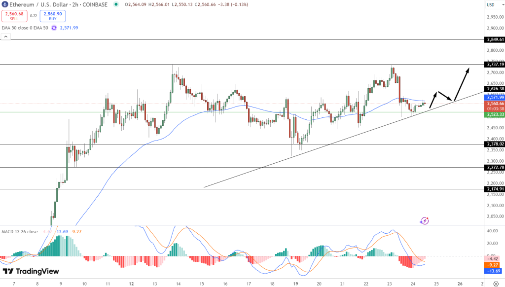 Ethereum price prediction seems bullish as 2 hour chart is showing a higher lows pattern from the $2,272 pivot, so the bullish momentum is sustained. Price is hovering around the 50 period EMA at $2,571—a key technical level.