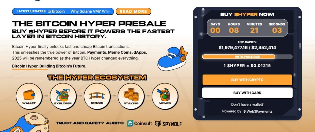 Bitcoin Hyper ($HYPER), the first Bitcoin-native Layer 2 powered by the Solana Virtual Machine (SVM), has raised nearly $2 million in its public presale, with $1,980,292 out of a $2,452,414 target. The token is priced at $0.01215, with the next price tier expected to be announced soon.