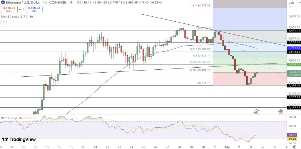 Ethereum price prediction is turning bullish as ETH is trying to recover from $3,374 – its lowest since early July. Price is testing the 0.236 Fib at $3,491, a level that was both support and resistance before.