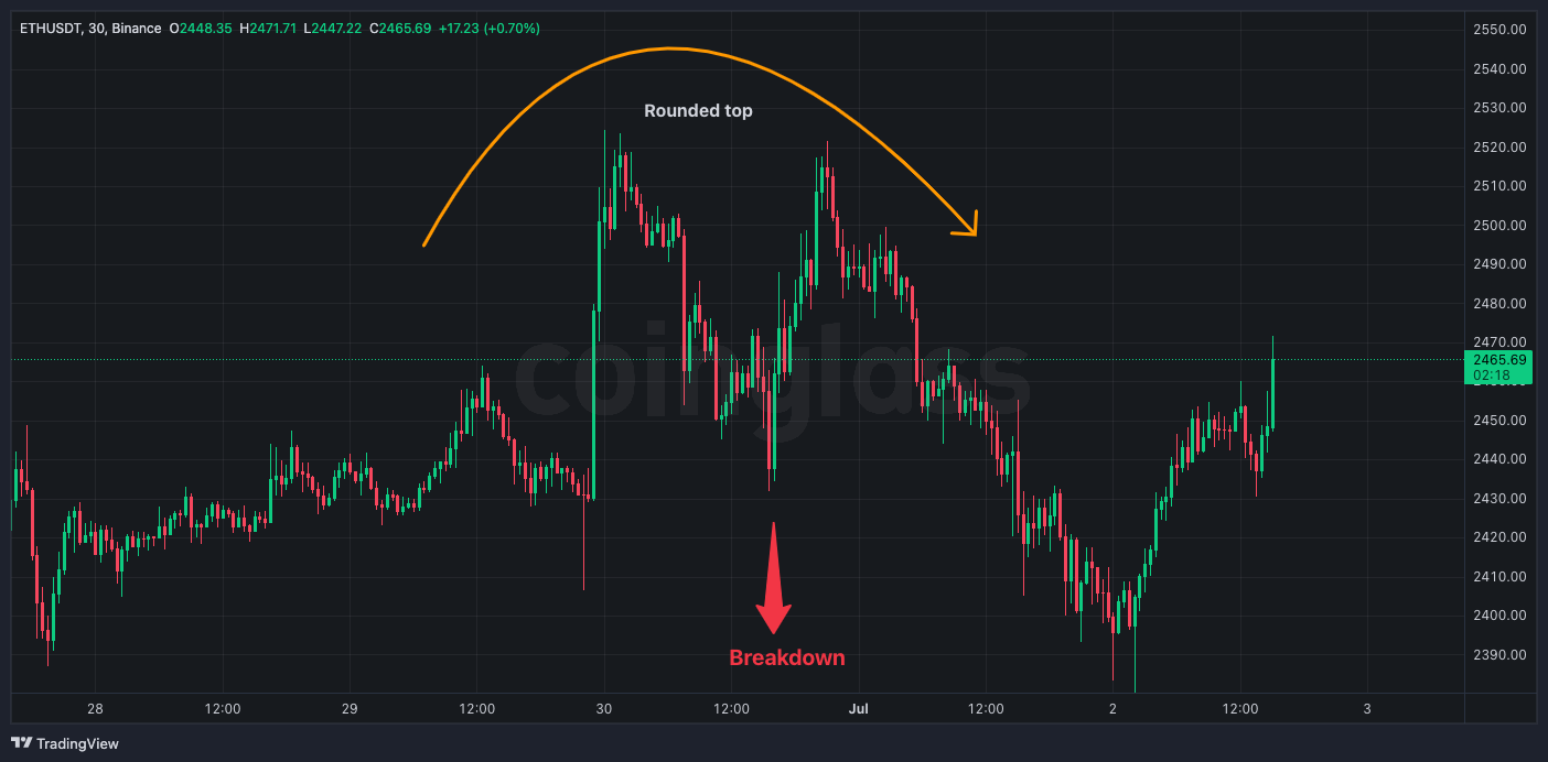 The arc began forming on June 29, with Ethereum gradually losing upward momentum after peaking just below $2,530.