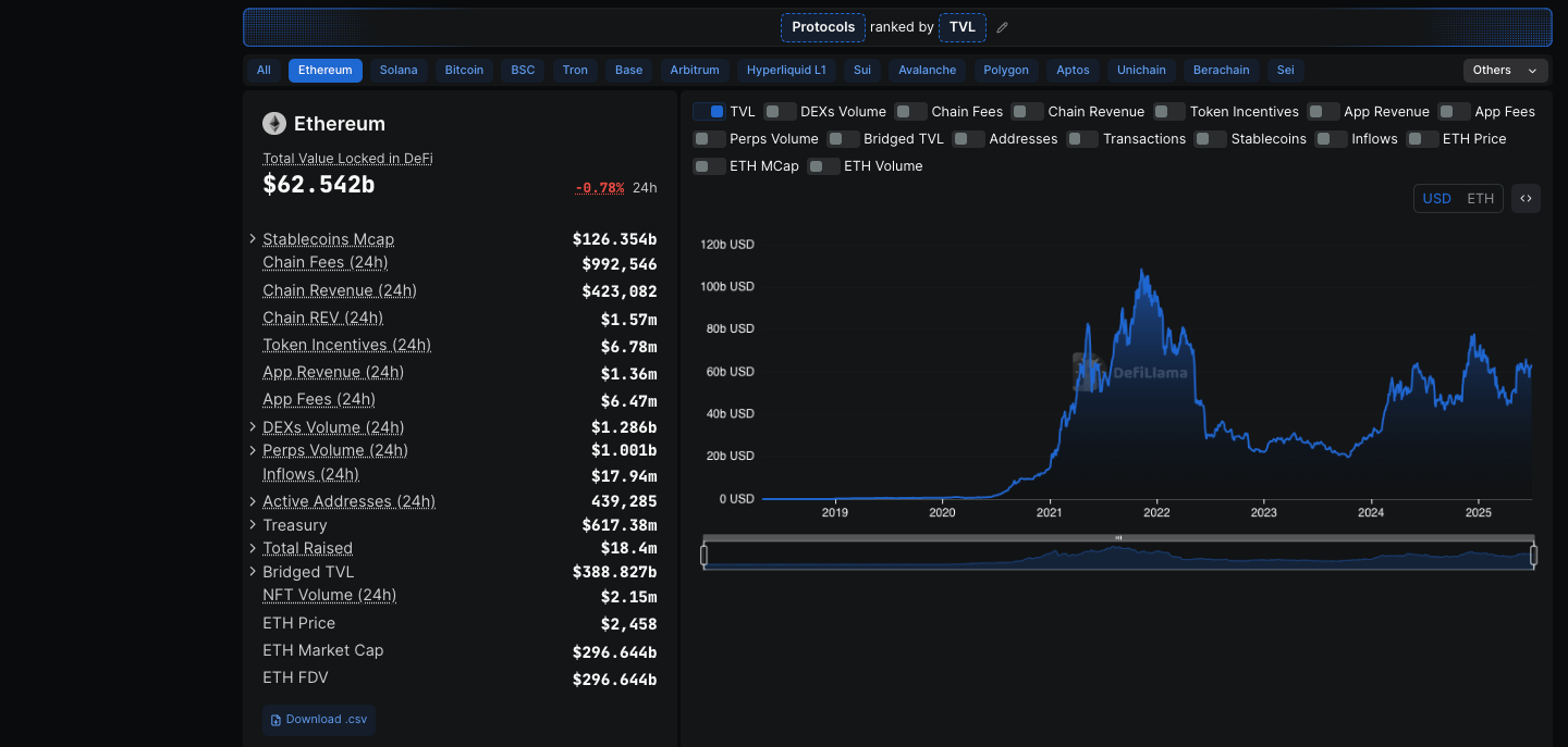 The network remains the leading blockchain for utility and trust, with a total value locked (TVL) of $62.6 billion, commanding 53% of global DeFi TVL. This surpasses competitors like Tron, which is primarily used for stablecoin transfers and centralized finance (CeFi) hybrids, as well as Solana and Avalanche.