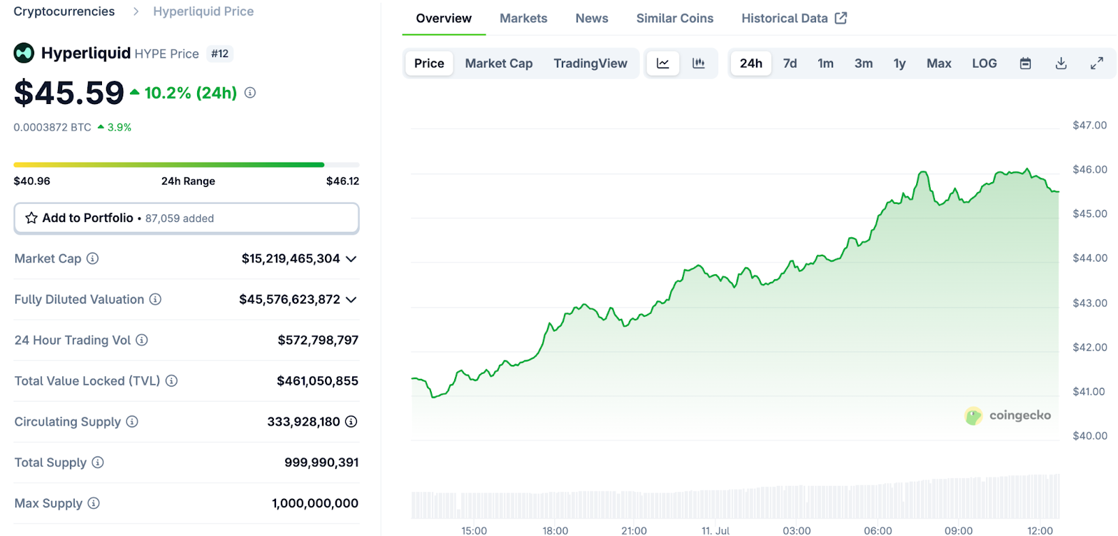 Hyperliquid ($HYPE) recently rallied to a new all-time high of $46.22 after rising more than 10% in the past 24 hours, although it has slipped back to trade at about $45.59 at press time.