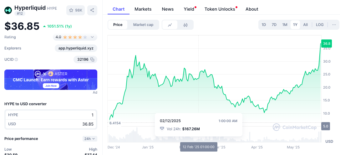 Hyperliquid ($HYPE) has blasted through barriers to hit a new all-time high of $37.44, soaring more than 20% in just 24 hours, to cement its position as one of the most explosive and unforgettable crypto launches in recent history.