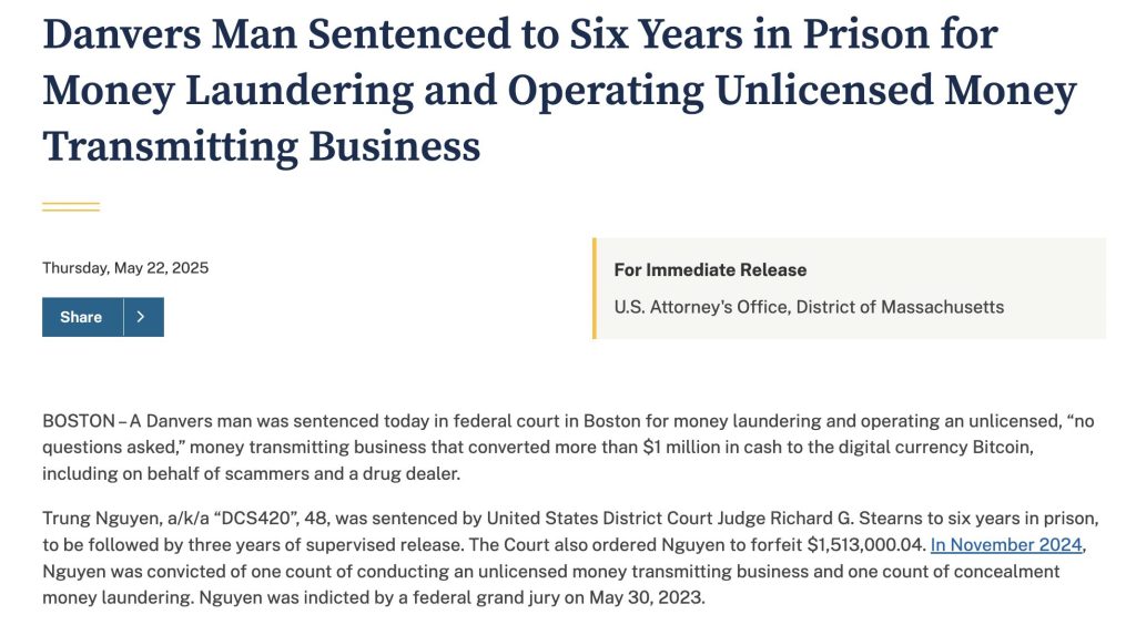 Nguyen, who also went by the alias “DCS420,” was convicted in Nov. 2024 of money laundering and operating an unlicensed money transmitting business.