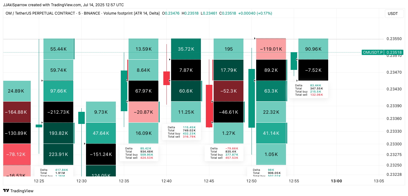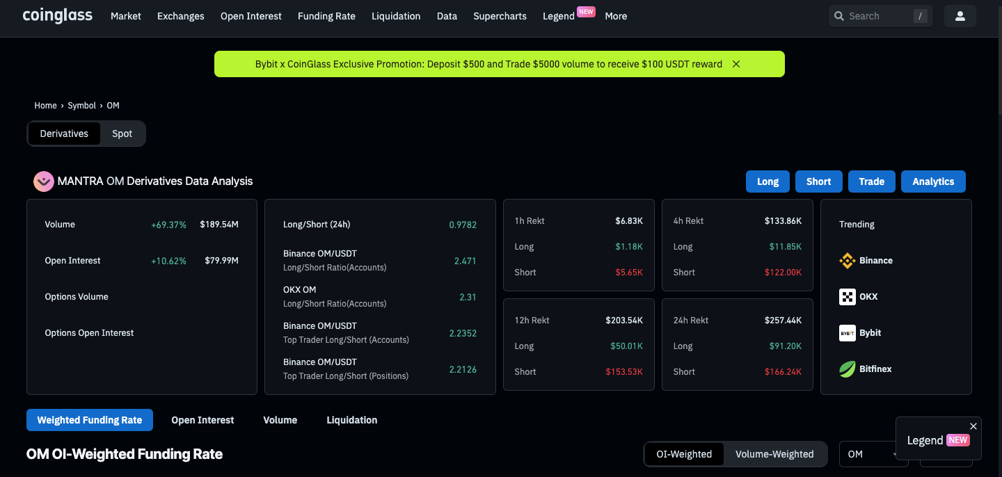 According to Coinglass data, $OM’s 24-hour trading volume rose +69.37% to $189.5 million, while open interest jumped +10.62% to $79.99 million, reflecting renewed trader conviction.