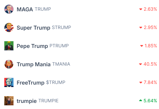 Trump Mania (TMANIA) decreased the most on this list (41%), followed by FreeTrump (TRUMP) (7.8%).