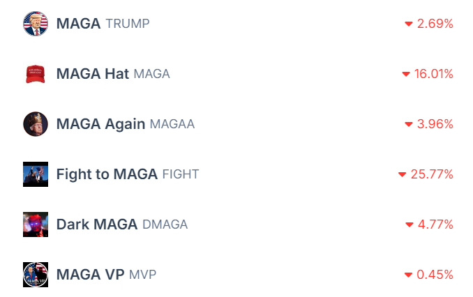 Coins related to Trump’s slogan ‘Make America Great Again’ (MAGA) are also down.