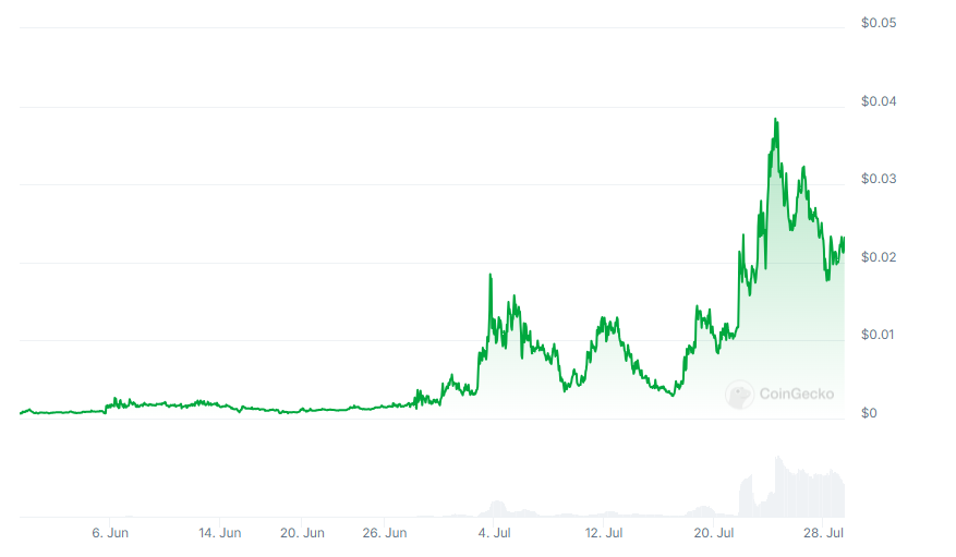 The coin has also increased by 3,552% from its all-time low, while it’s down 42.5% from its all-time high of $0.03919 recorded five days ago.