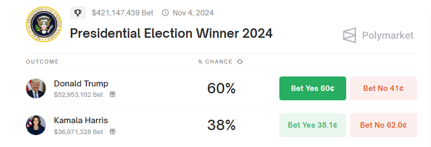 Meanwhile, Kamala Harris’ percentage on Polymarket continues rising as well, now standing at 38% compared to Donald Trump’s 60%.