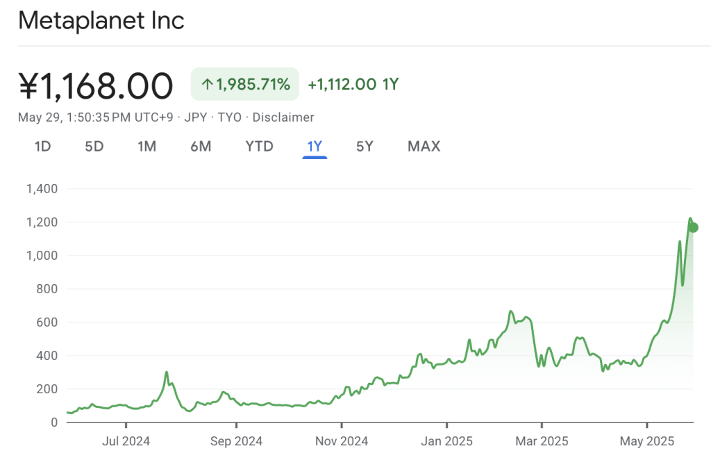 Besides, Metaplanet’s stock has shot up more than 1,985% in the last year and is trading for 1,168 Japanese yen ($8.01), according to Google Finance.