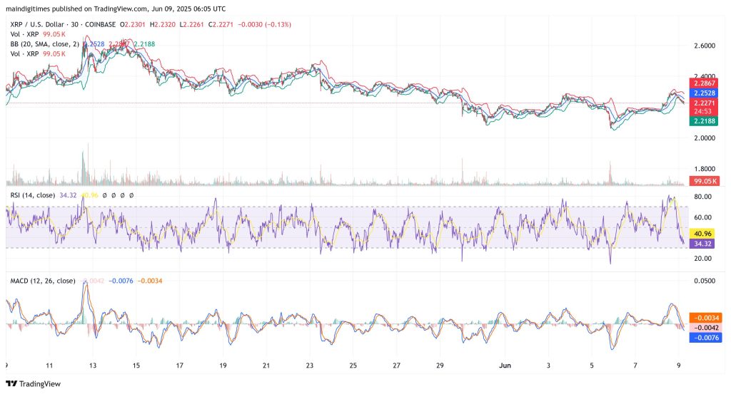 On the 2-hour chart, XRP faced strong resistance around $2.30 and failed to sustain upward momentum, retreating to the lower Bollinger Band at $2.14.
