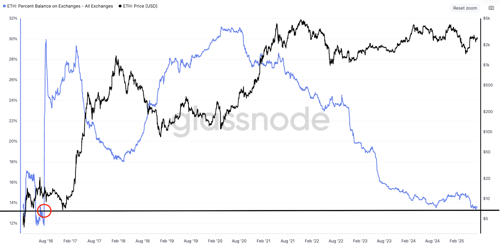 Beyond Wall Street, Ethereum’s fundamentals continue to strengthen. On-chain data shows ETH balances on exchanges are at their lowest in eight years, now sitting at just 13.5%. That’s a signal of a looming “supply shock,” as whales accumulate and withdraw ETH into long-term holdings.