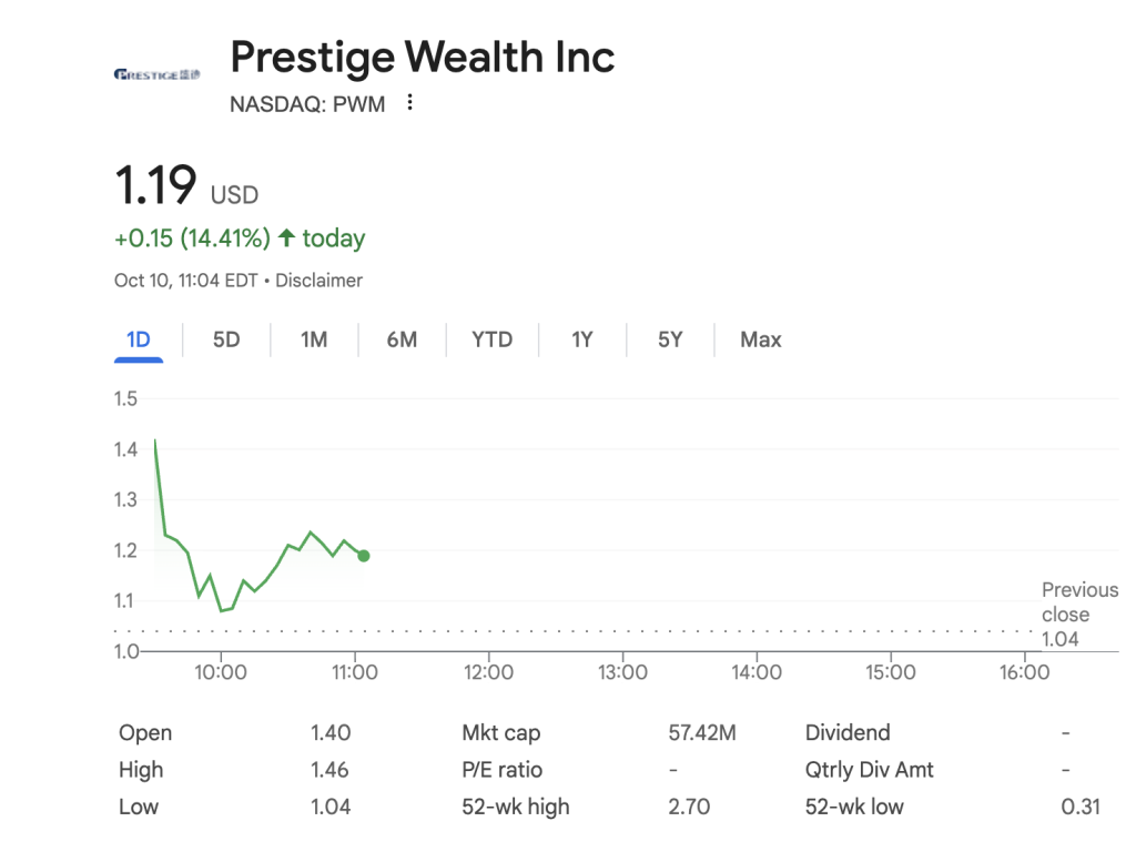 Shares of Prestige Wealth Inc. rose sharply on Friday, climbing 14.4% to $1.19 as of 11:04 a.m. EDT, following the company’s announcement that it had secured $150 million in financing to launch NASDAQ’s first Tether Gold Treasury.