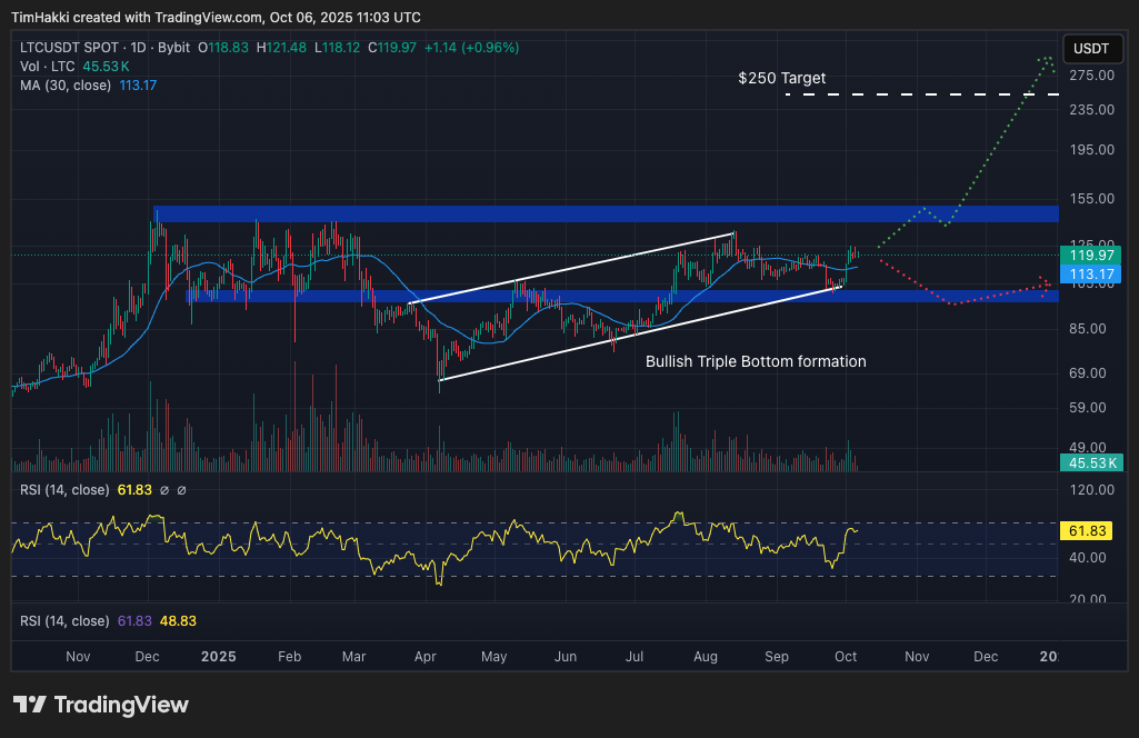Unlike most cryptos that mirrored Bitcoin’s slump from late 2024 to early 2025, Litecoin maintained a solid footing, repeatedly testing resistance at $140 while holding strong support at $100.