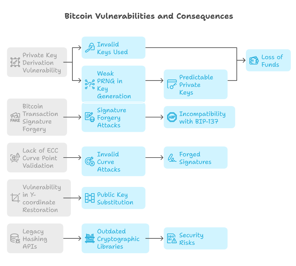 The function’s flawed logic allows attackers to exploit non-standard message formatting and generate forged ECDSA signatures that validate legitimate Bitcoin transactions.