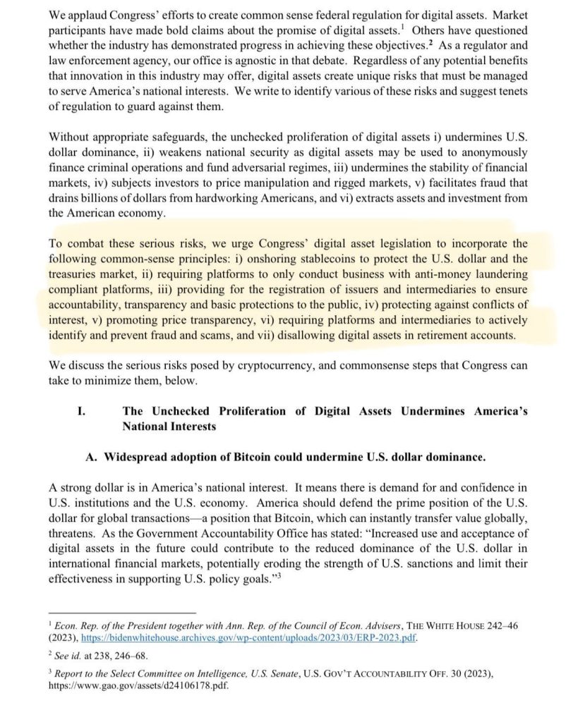 She flagged the “unique risks” posed by cryptos, calling for a change in order to “serve America’s national interests.”