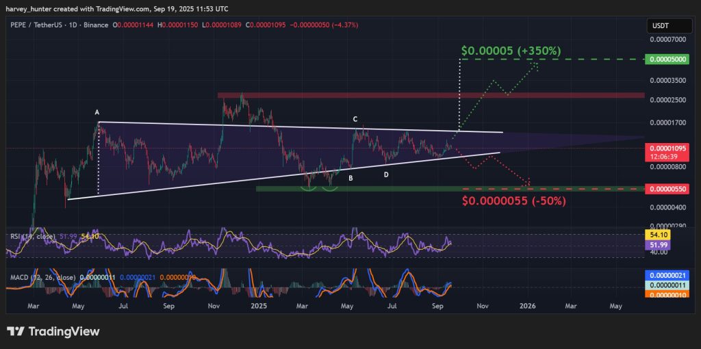 Once overcome, the PEPE price could reclaim the next key resistance at $0.000028. But a fully realised breakout sets a potential $0.00005 target, a 350% move from current levels.