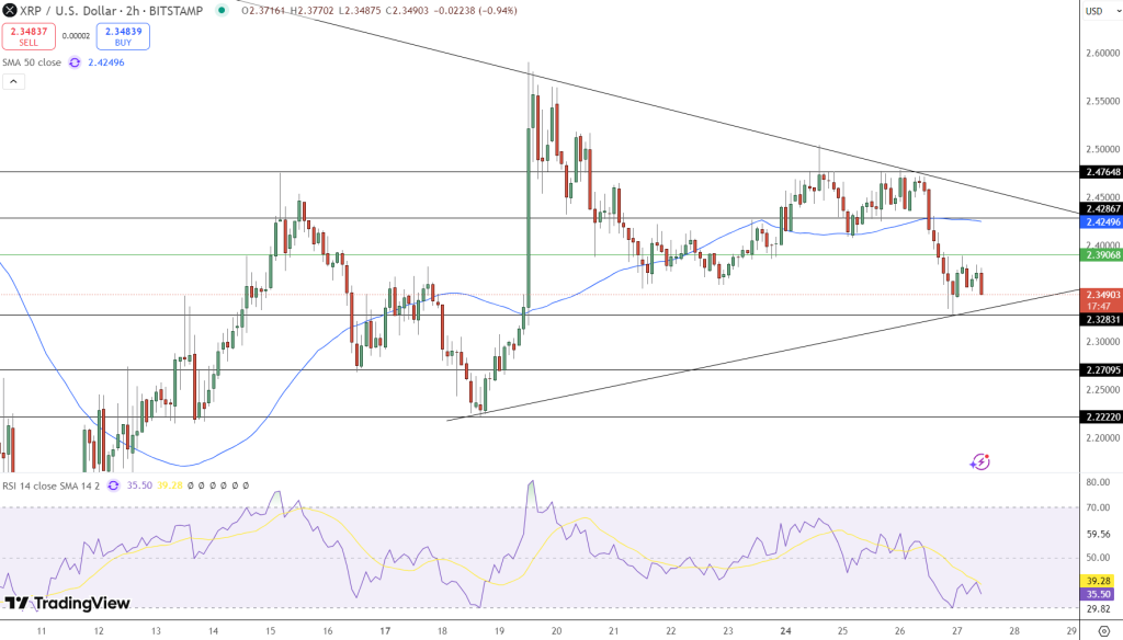 The RSI at 39.27 signals weak momentum. Traders should await a decisive breakout below $2.32 or above $2.42 for clearer direction.
