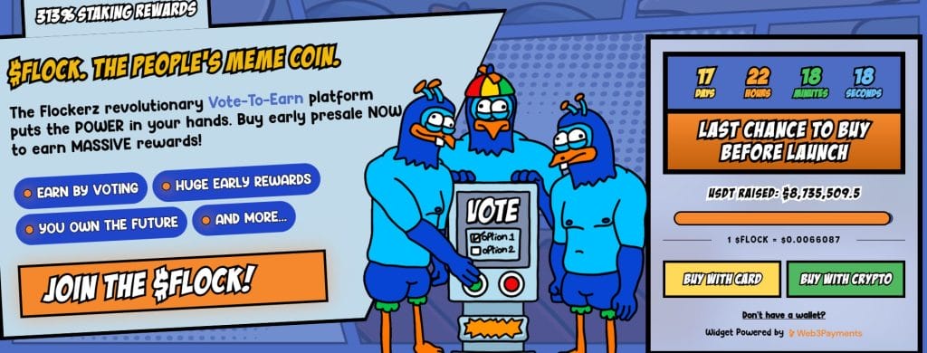 Flockerz ($FLOCK) presale has now raised an impressive $8.73 million, with the token price at $0.0066087. With just 17 days and 22 hours remaining before the launch, investors have a limited window to participate in this rapidly growing project.