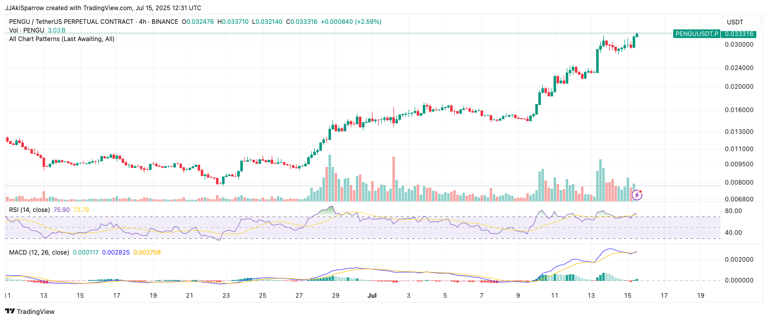 The rally continued into July 15, carrying $PENGU to fresh highs and is currently trading around $0.03455.