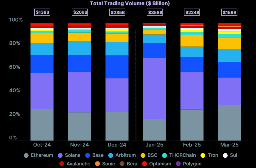That said, Ethereum reclaimed the top spot in March, the report said, with a 30.1% market share compared to Solana’s 23.4%.