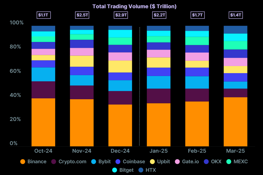 Binance was still the dominant spot CEX, with a 40.7% share at the end of the quarter. While its market share increased over the quarter, its trading volume fell to $588.7 billion in March. In comparison, it surpassed the $1 trillion mark in December.