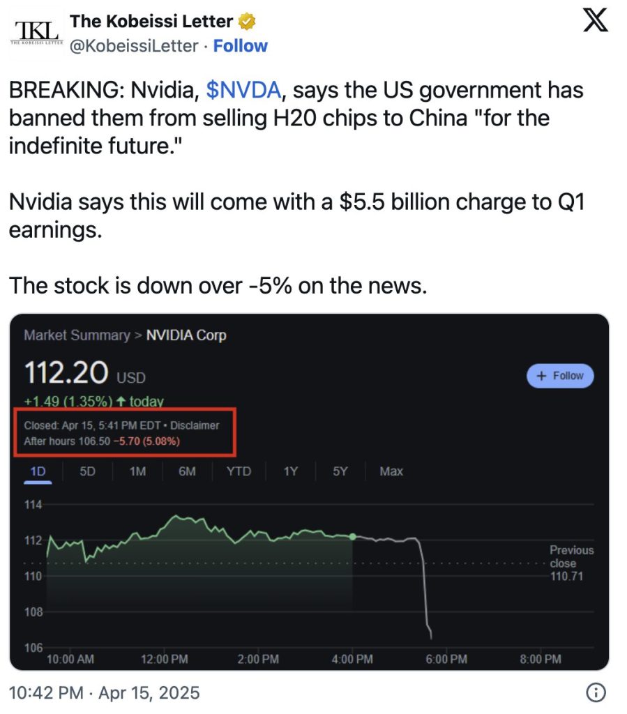 In a regulatory filing on April 15, Nvidia said the U.S. government had informed the company on April 9 that new export licenses are required for its high-bandwidth AI chips.