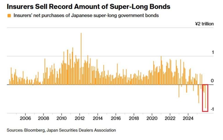 Institutional flows reveal the pressure, with Japanese insurers selling $5.2 billion of bonds with maturities beyond ten years in December alone.