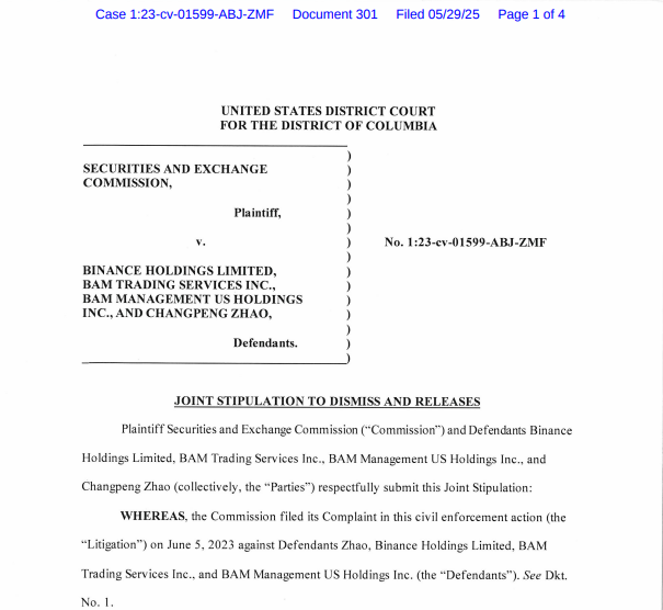 SEC Dismisses Civil Case Against Binance and Changpeng Zhao