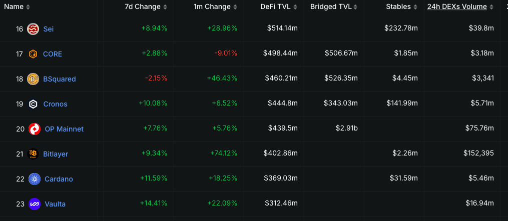 For instance, Cronos is currently ranked 42nd with a $2.6 billion market cap, Optimism ranks 65th with $1.32 billion, and Cardano sits in the top 10 with a valuation exceeding $28 billion, despite trailing Sei in DeFi activity metrics.